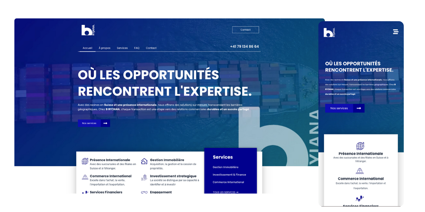 Création d’un site vitrine professionnel pour B-RYJANA SA, une entreprise spécialisée dans le commerce international, l’investissement et la gestion de services. Le projet a consisté à concevoir une présence digitale moderne, fiable et élégante, permettant de présenter clairement les activités de l’entreprise tout en renforçant sa crédibilité auprès de partenaires et investisseurs internationaux. Un soin particulier a été apporté à la navigation, à la structure des contenus et à l’optimisation mobile afin d’offrir une expérience fluide, premium et cohérente avec l’univers de la marque B-RYJANA.